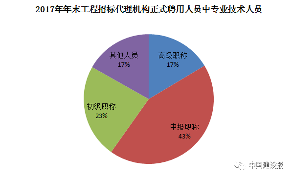 2017年年末工程招标代理机构正式聘用人员中专业技术人员合计457125人,比上年下降1.55%。其中,高级职称人员74779人,中级职称198455人,初级职称107080人,其他人员76811人。专业技术人员占年末正式聘用人员总数的85%。