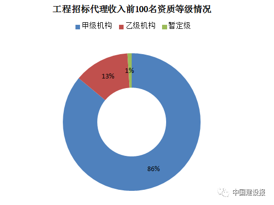 2017年度工程招标代理机构工程招标代理收入前100名中,从资质等级来看,甲级机构86个,乙级机构13个,暂定级1个。