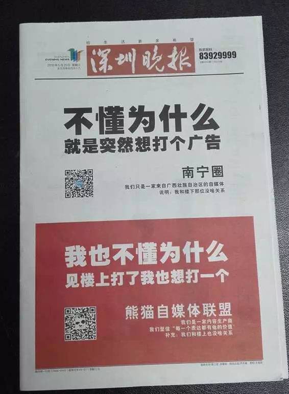 深圳晚报头版广告的设计运用一种巧妙的方式,将报纸的权威感与互联网式的戏虐表达结合在一起,一度引爆朋友圈,例如“不懂体”、“垫虾壳”和“我要让全世界都知道我很低调”等名句都出自于深圳晚报的头版。